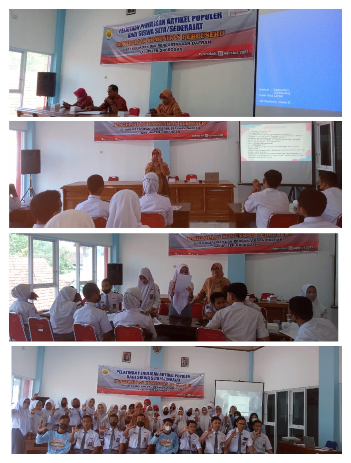 Kegiatan “Penulisan Artikel Populer Siswa SLTA” dilaksanakan di Aula Dinarpusda dan diikuti oleh 50 (lima puluh) peserta dari perwakilan siswa SLTA se-Kabupaten Grobogan. Tujuan kegiatan ini adalah membiasakan para peserta untuk menuangkan ide/gagasan kedalam suatu karya tulis dan mengembangkan minat baca tulis generasi muda.