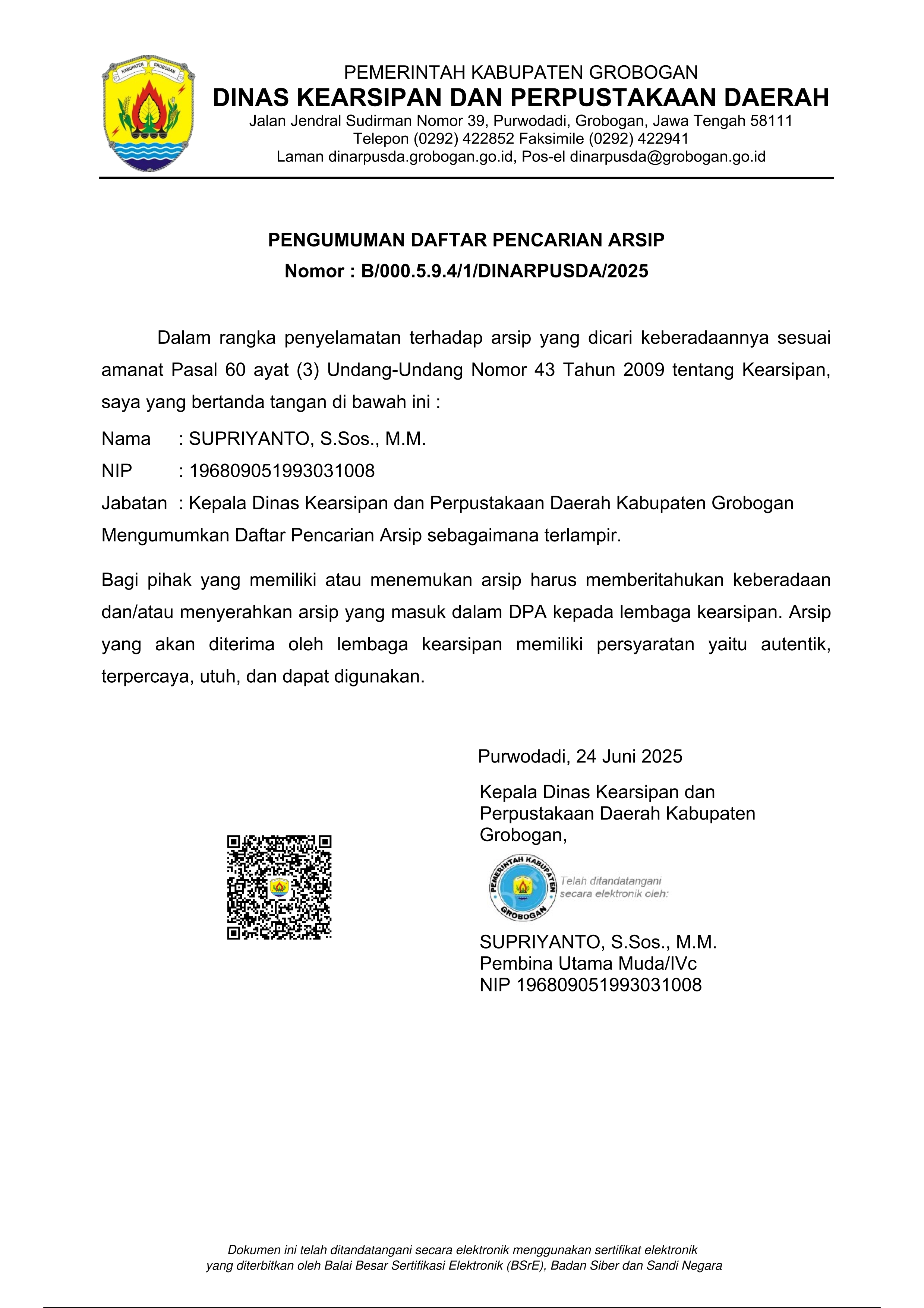 Selasa, 24 Juni 2025 — Dalam rangka meningkatkan kapasitas perangkat desa dalam pengelolaan arsip pemerintahan yang tertib dan sesuai ketentuan, Dinas Kearsipan dan Perpustakaan Daerah Kabupaten Grobogan menyelenggarakan kegiatan Sosialisasi dan Pembinaan Pengelolaan Arsip Desa secara daring melalui Zoom Meeting.