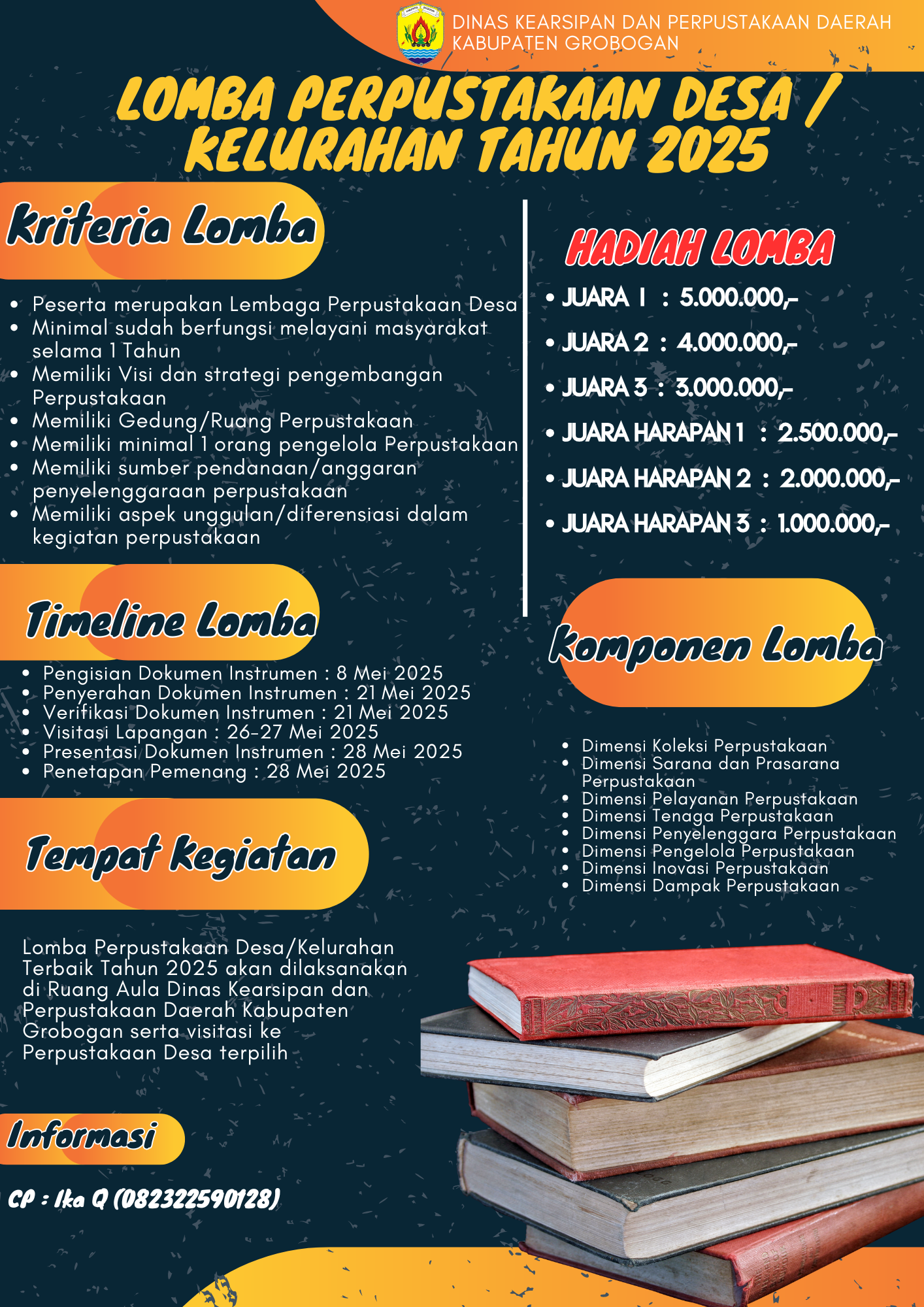 Dalam rangka meningkatkan minat baca masyarakat dan mendorong pengelolaan perpustakaan desa yang inovatif dan berdaya guna, Dinas Kearsipan dan Perpustakaan Kabupaten Grobogan mengadakan Lomba Perpustakaan Desa Tingkat Kabupaten/Kota