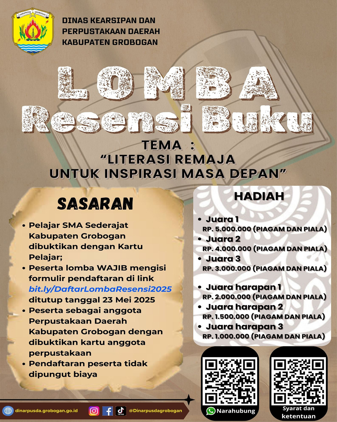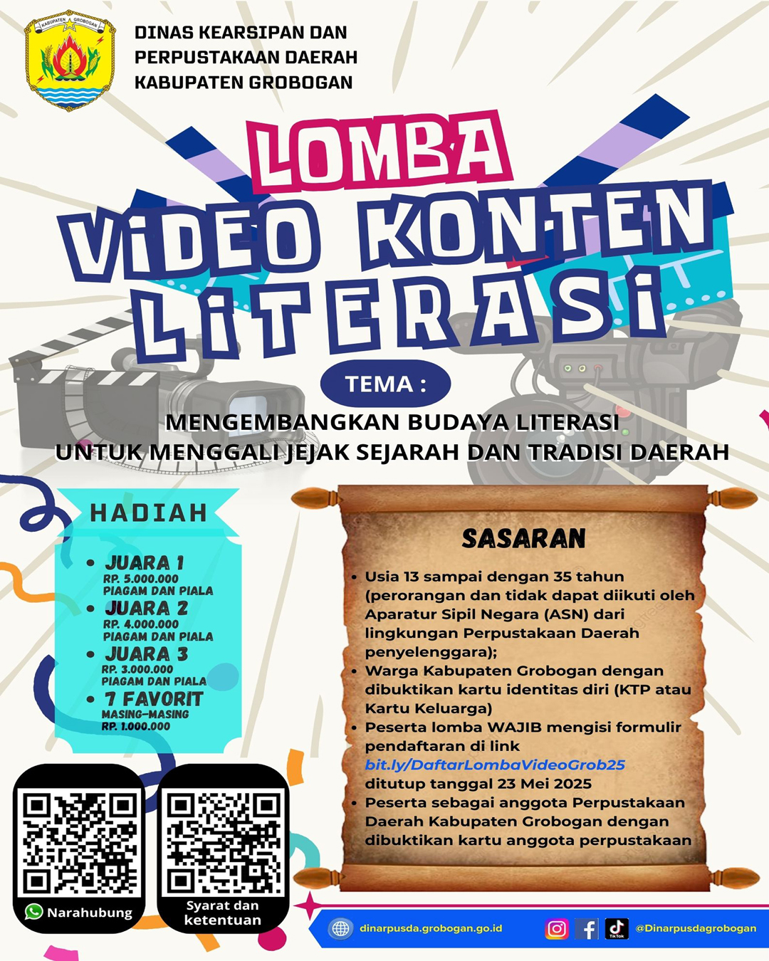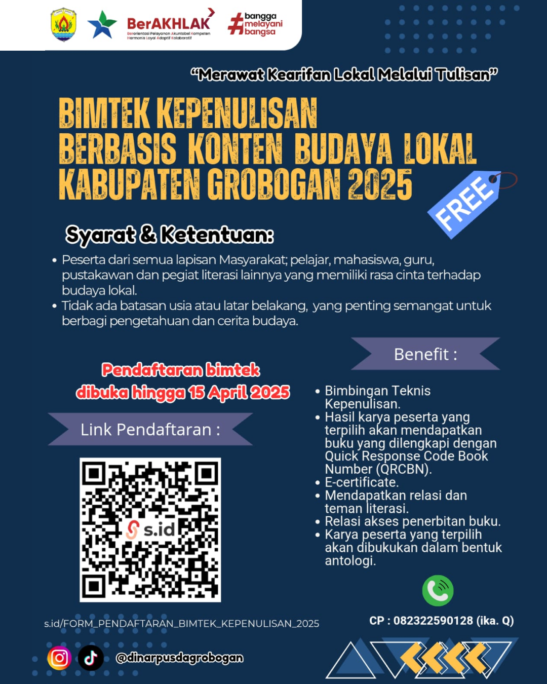 Mari berkontribusi dalam melestarikan dan mengenalkan budaya serta kearifan lokal yang kaya dari daerah kita! Kami mengajak Anda untuk menulis esai atau artikel yang menggali dan mempromosikan kekayaan budaya serta kearifan lokal yang ada di Kabupaten Grobogan.